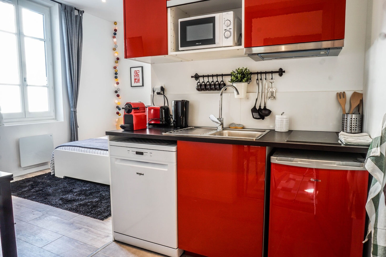 La cuisine est entièrement équipée avec frigo, lave-vaisselle, micro-ondes, plaques électriques, bouilloire, grille-pain, machine à café Nespresso avec capsules et thés, vaisselle, casseroles, poêles et ustensiles de cuisine.