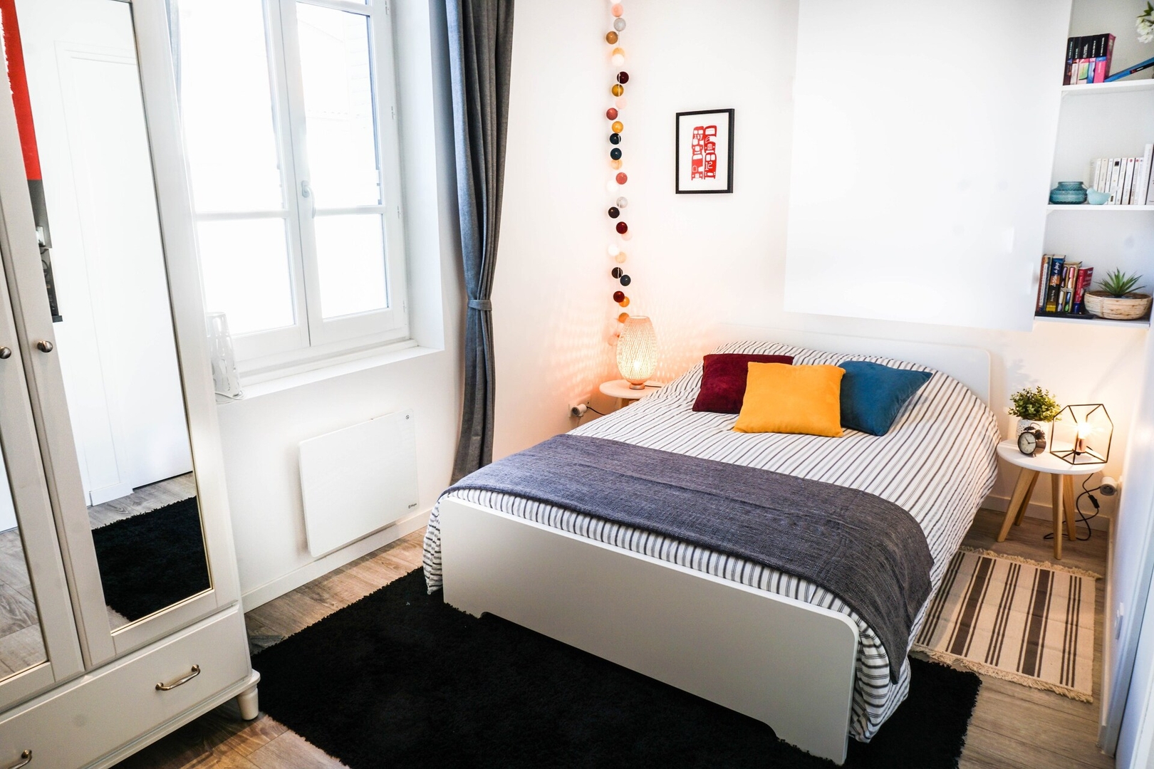 La pièce à vivre se compose d’un espace salle à manger avec table et chaises, d’une grande armoire pour ranger vos affaires, d’une télé avec Netflix ; et d’un espace nuit avec un lit double, deux oreillers, une couette et du linge de lit fourni.